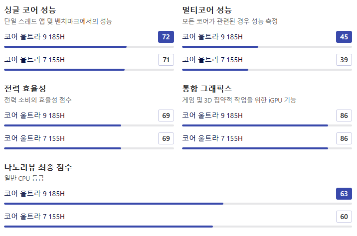 • 185H가 더 높은 클럭을 갖고 있어 전성비 또한 조금 더 높게 측정되는 편입니다. (각 항목서 155H 대비 약 10~30%가량 우세)