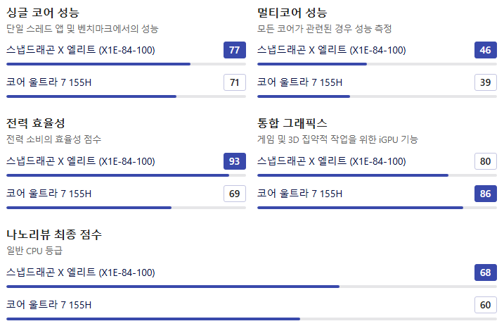| 항목 | Snapdragon X Elite (X1E-84-100) | Core Ultra 7 155H |