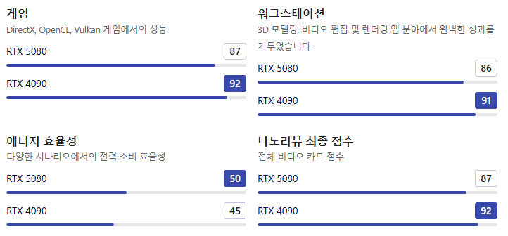 • 반면, RTX 5080은 더 발전된 4nm 공정을 사용하여 소비전력(TGP)이 360W로, RTX 4090의 450W보다 90W(20%) 낮습니다.