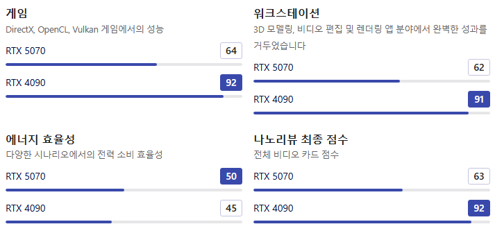 • RTX 4090은 절대적인 성능을 위해 높은 전력을 요구하는 반면, RTX 5070은 훨씬 적은 전력으로 효율적인 성능을 제공하는 데 중점을 둡니다.