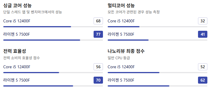 | 기본 성능 지표 | Core i5 12400F | Ryzen 5 7500F |