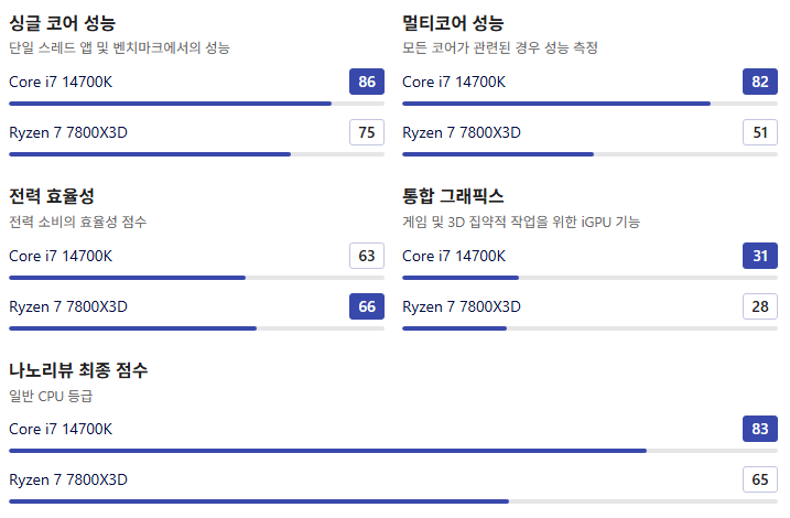 | 기본 성능 지표 | Core i7 14700K | Ryzen 7 7800X3D |