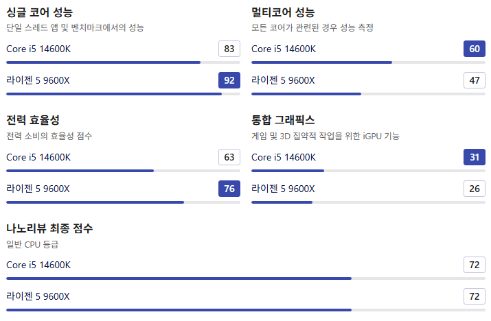 | 기본 성능 지표 | Core i5 14600K | Ryzen 5 9600X |