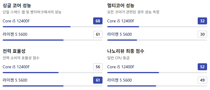 | 항목 | Core i5 12400F | Ryzen 5 5600 |