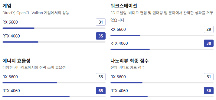 | Raw 성능 지표 | RX 6600 | RTX 4060 |