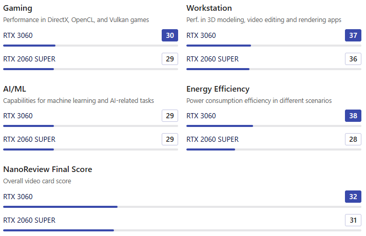 • 종합 성능 점수에서도 두 모델의 차이는 크지 않았습니다. 최신 게임 성능을 측정하는 Steel Nomad Lite에서는 RTX 3060이 약 9% 앞섰지만, 나머지 테스트에서는 거의 동일한 점수를 기록했습니다.