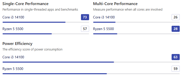 | PassMark CPU Mark | Core i3 14100F | Ryzen 5 5500 |