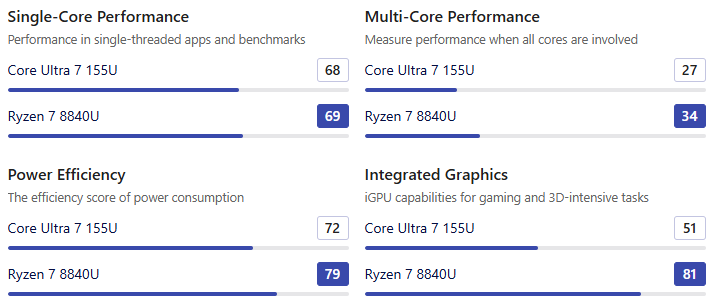 | 기본 성능 지표 | Core Ultra 7 155U | Ryzen 7 8840U |