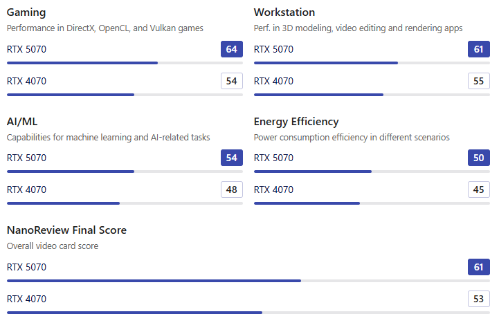 • 이는 RTX 5070이 최신 기술과 레이 트레이싱 환경에서 더 나은 최적화를 보여준다는 것을 의미하며, 종합적인 잠재력은 더 높다고 평가할 수 있습니다.